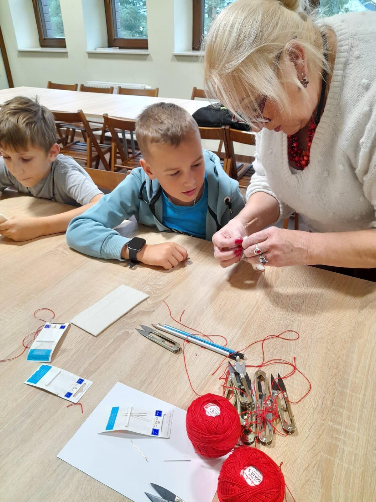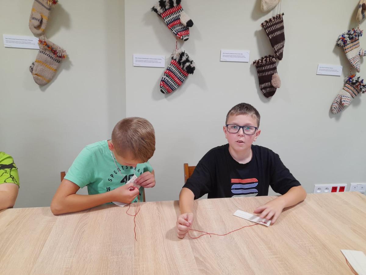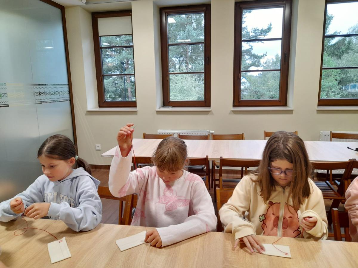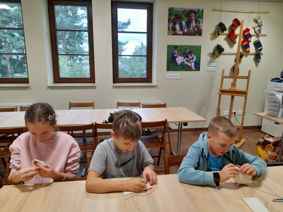 uczestniczyli w warsztatach folklorystycznych, poznając elementy stroju regionalnego i próbując swoich sił w hafcie,