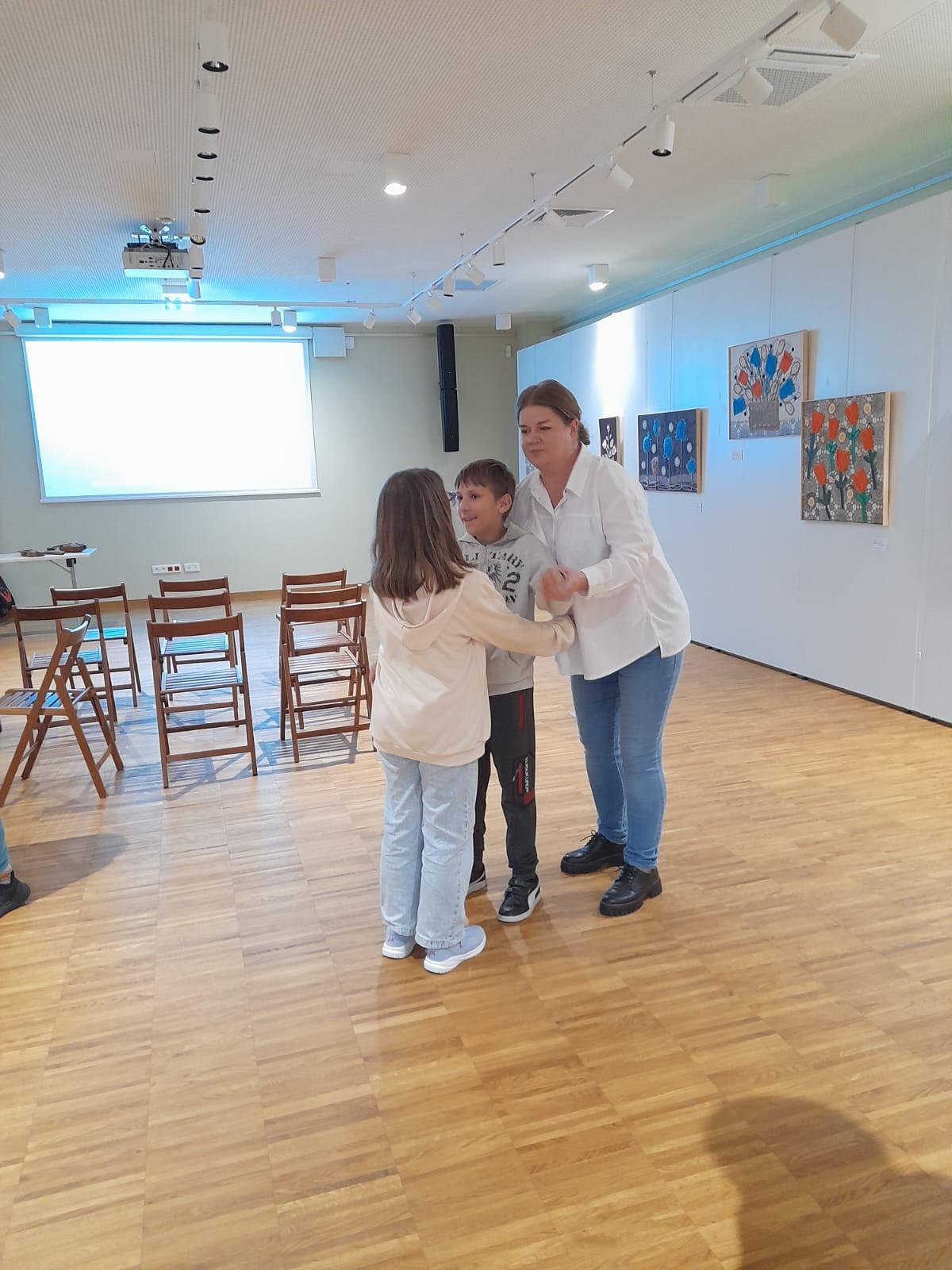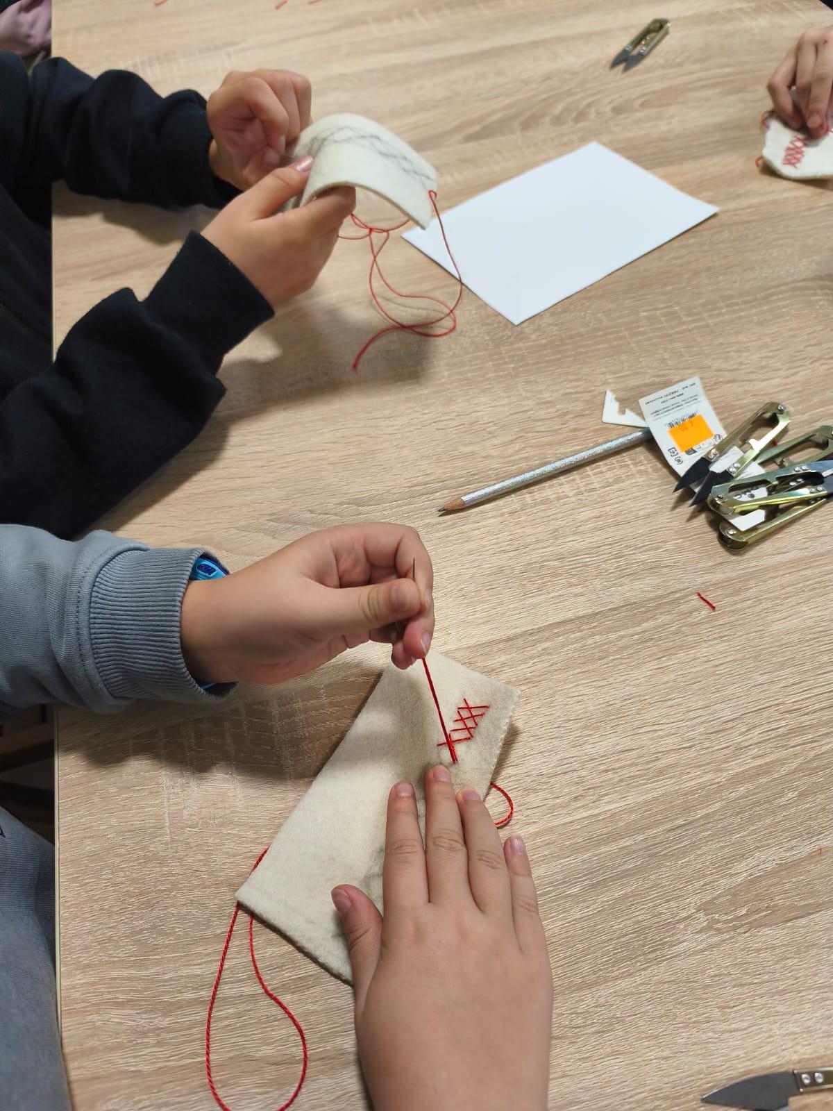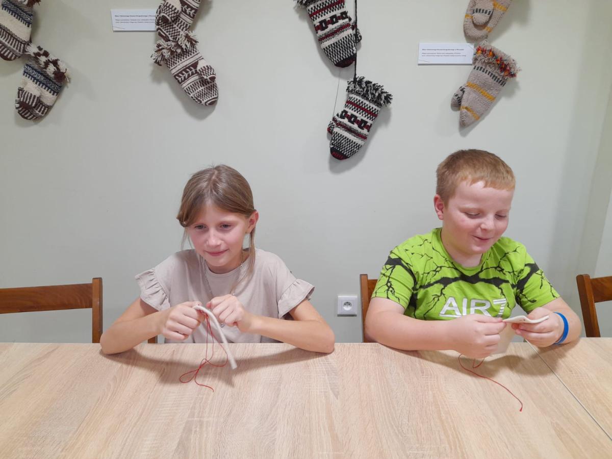 uczestniczyli w warsztatach folklorystycznych, poznając elementy stroju regionalnego i próbując swoich sił w hafcie,
