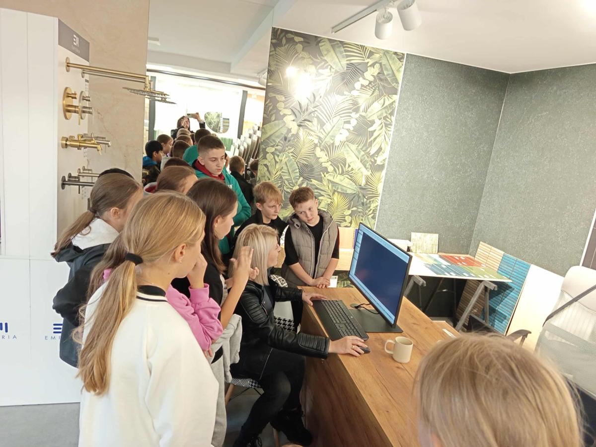 Uczniowie mogli zobaczyć różne rodzaje płytek i poznać zasady ich doboru do wnętrz. Największą atrakcją było samodzielne zaprojektowanie wymarzonej łazienki — uczniowie wykazali się dużą kreatywnością i pomysłowością.