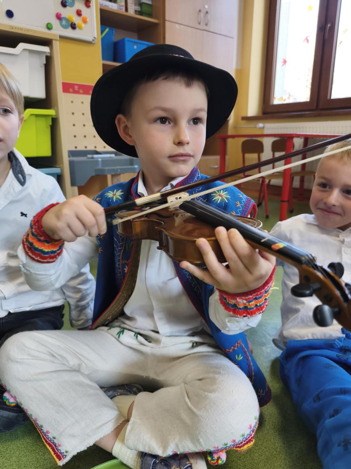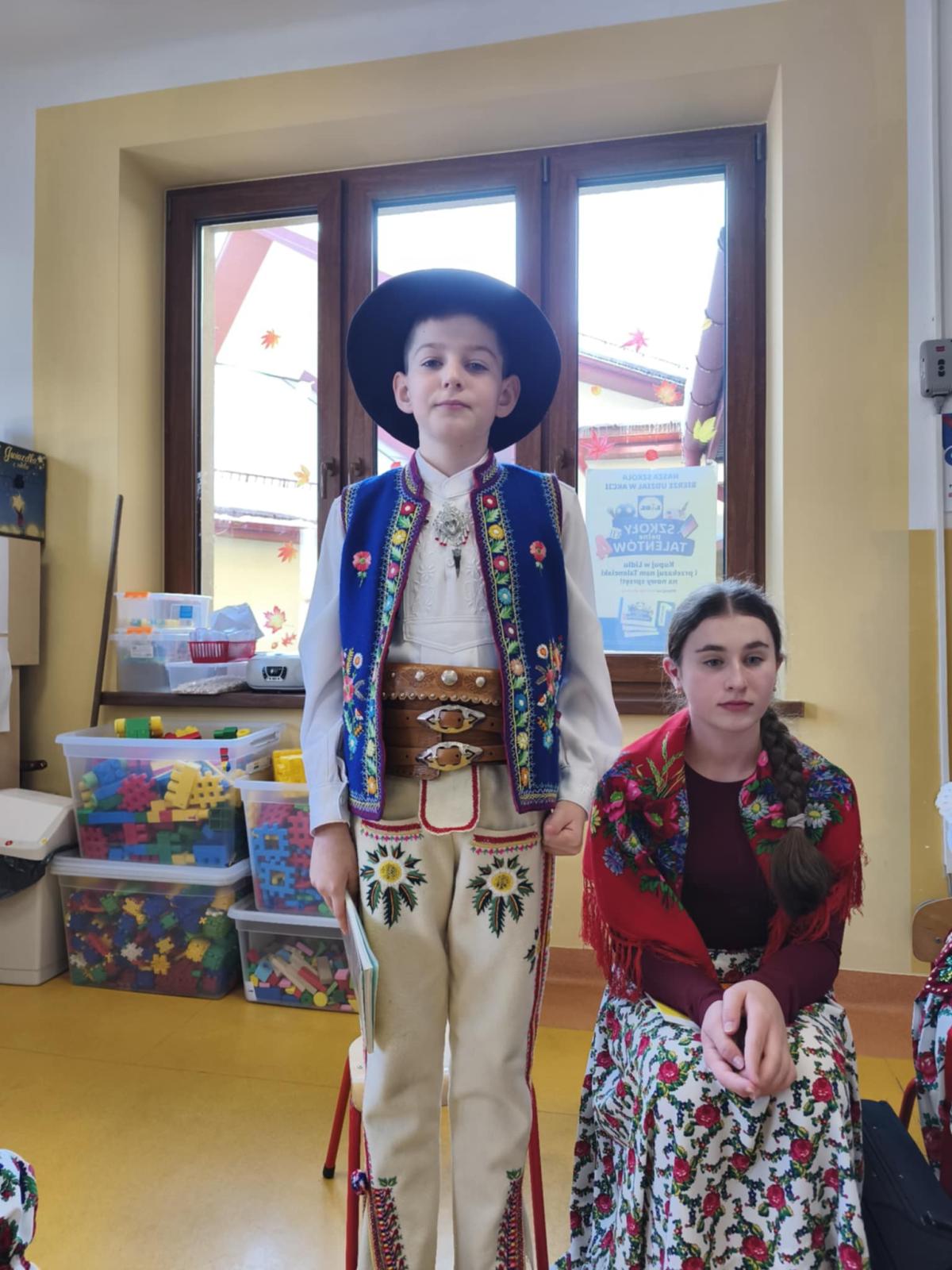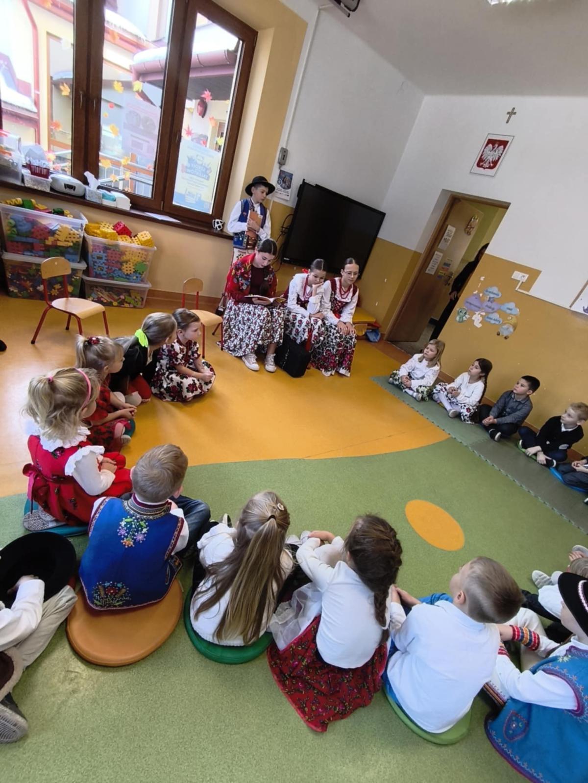 Katarzyna Wolska i Jan Wolski czytali młodszym kolegom gawędy góralskie oraz opowiadali ciekawostki dotyczące elementów stroju góralskiego.