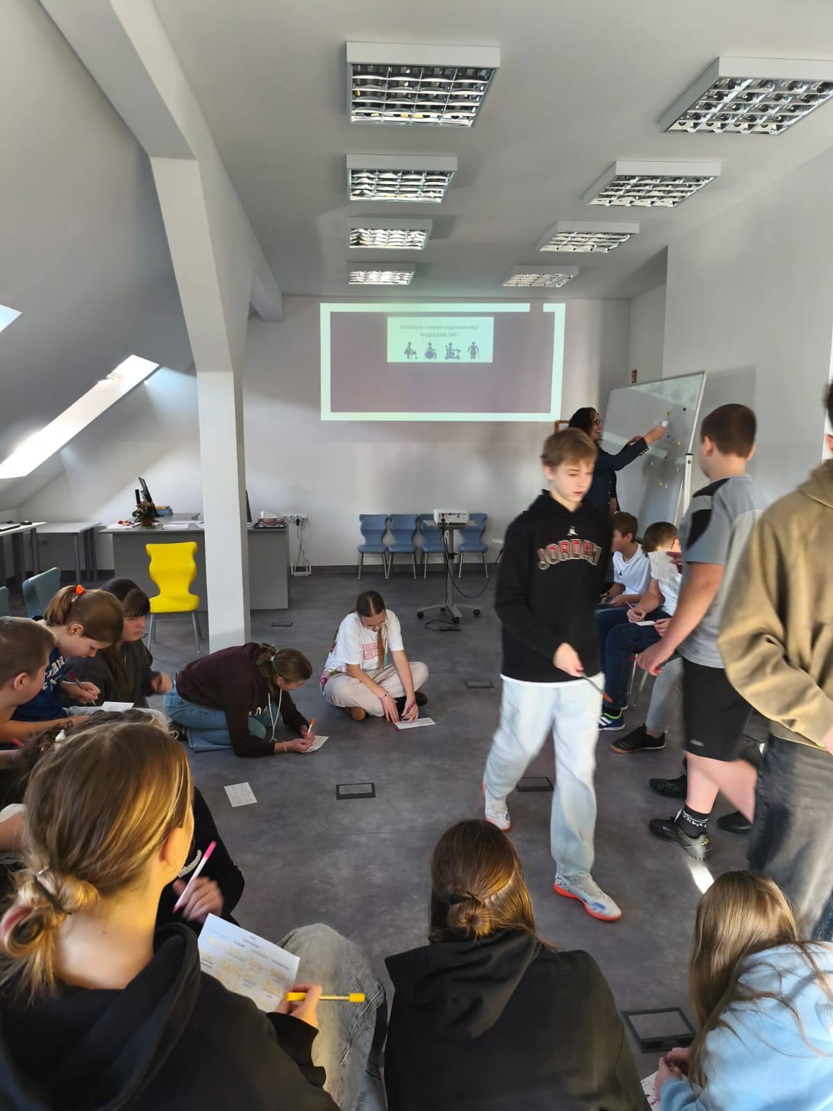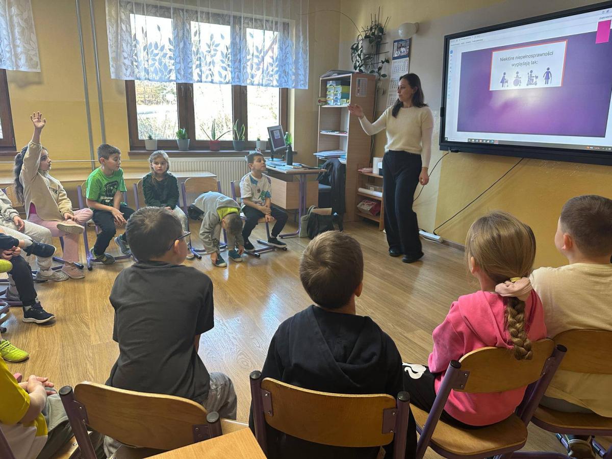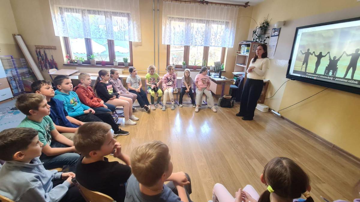 Kolejnym ważnym elementem działań były warsztaty pt. „Traktowanie z równością – pomimo różnic”, w których uczestniczyli uczniowie klas 1–8. Podczas spotkania uczniowie wspólnie odkrywali, jak ważne jest równe traktowanie wszystkich ludzi – niezależnie od wieku, sprawności, wyglądu czy płci. Poruszono temat osób z niepełnosprawnościami, ich potrzeb oraz sposobów mądrego wspierania ich w środowisku szkolnym. Rozmawiano także o równości kobiet i mężczyzn, roli kobiet oraz konieczności przełamywania stereotypów.