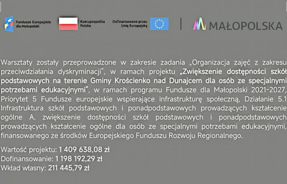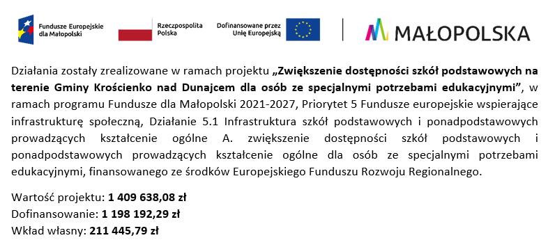 „Zwiększanie dostępności szkół podstawowych na terenie Gminy Krościenko nad Dunajcem dla osób ze specjalnymi potrzebami edukacyjnymi”,