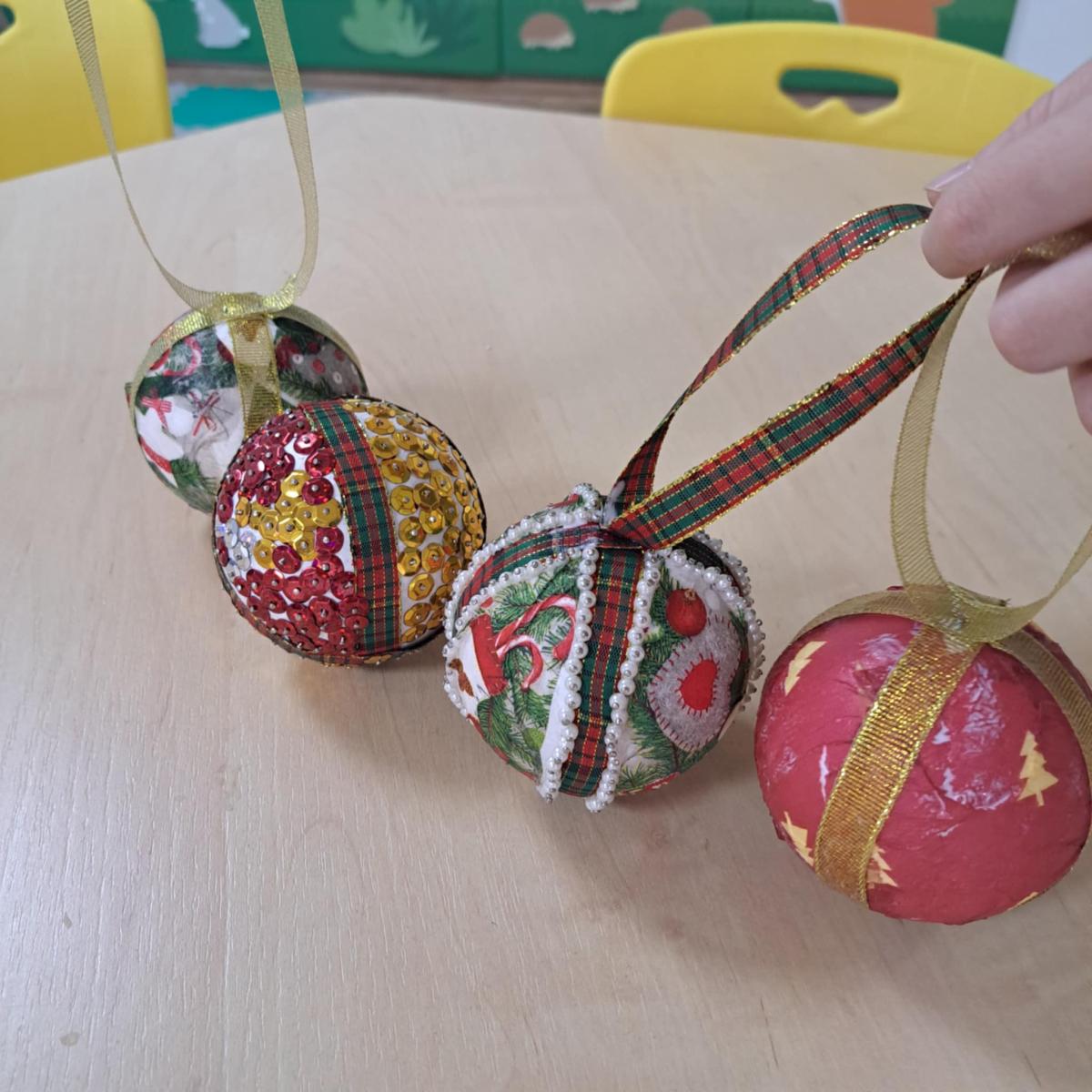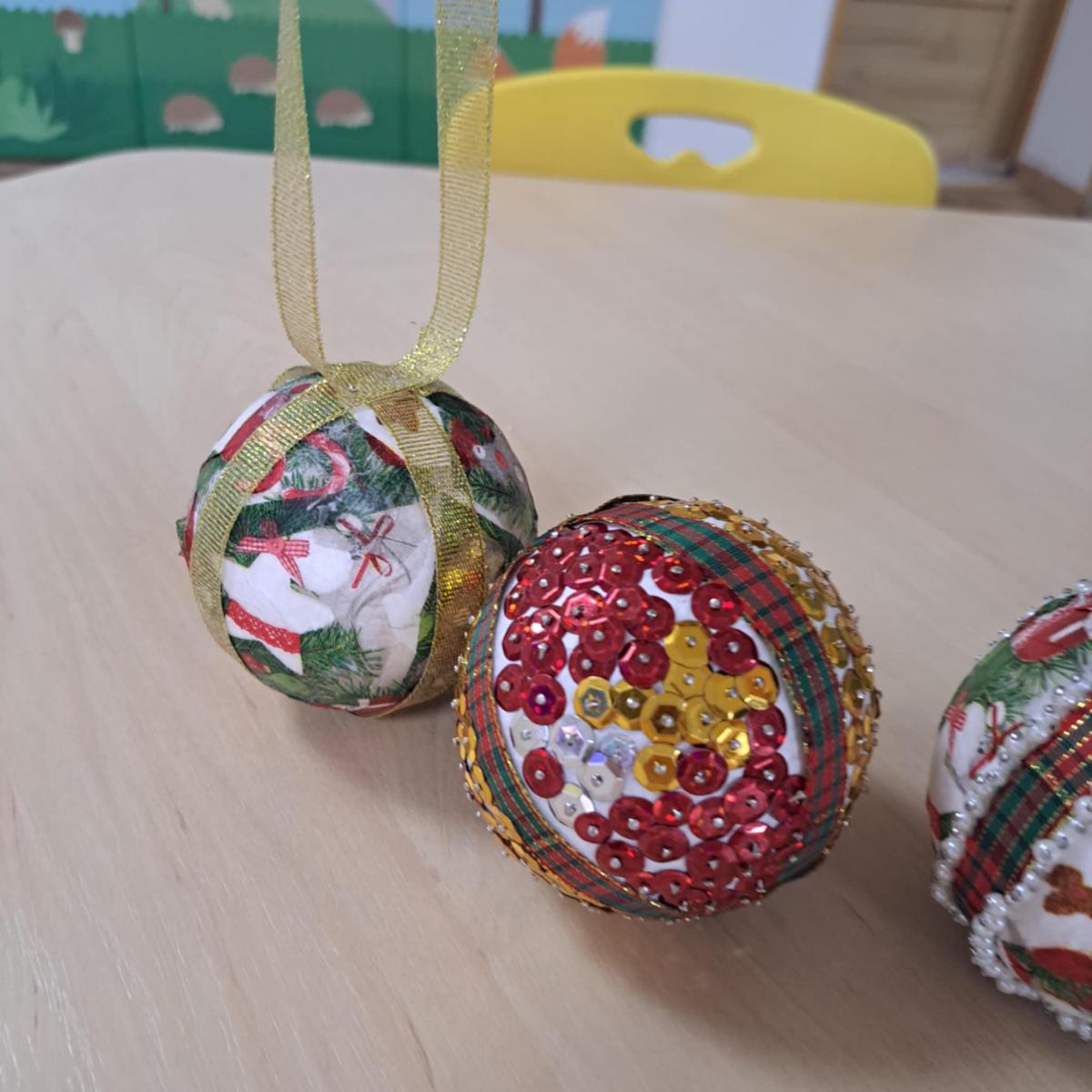 Uczestnicy warsztatów z dużym zaangażowaniem wykonywali kolorowe i pomysłowe ozdoby, wykazując się kreatywnością i starannością. Powstałe podczas zajęć wspaniałe bombki z pewnością wprowadzą świąteczny klimat i ozdobią choinki bożonarodzeniowe w tym roku.
